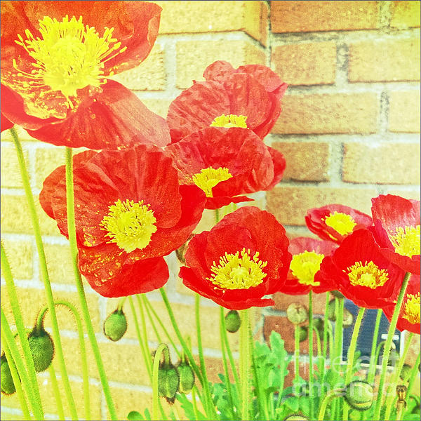 Bright red poppies with cheerful yellow centers against a gritty brick wall. Poppies will pretty much grow anywhere with some warmth and strong... more